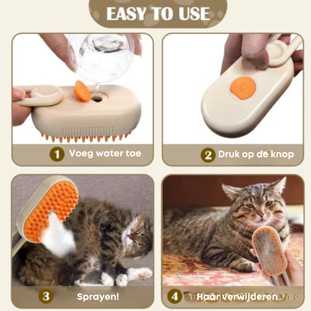 De sprayfunctie is geweldigz; voor het aanbrengen van verzorgingsproducten. De SteamPaws™ maakt de verzorging zo veel gemakkelijker en efficiënter!”
